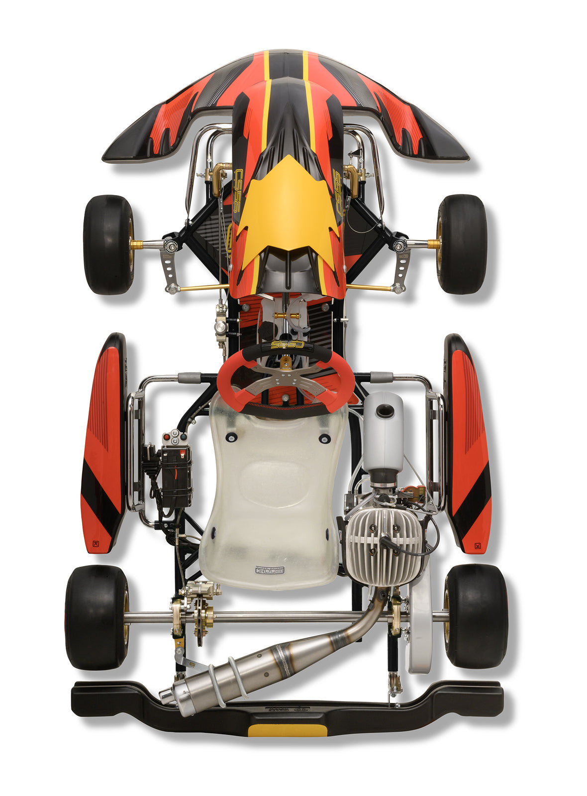 The EVM chassis is equipped with the innovative M9 Nassa Panel and Nose Cone kit, strongly inspired by the M11 model on the Senior kart. The side pods and rear bumper remain unchanged. Attention to detail at the aerodynamic level is evidenced by the introduction of a new integral floor tray, able to reducing vortex and turbulence ultimately leading to better laptimes