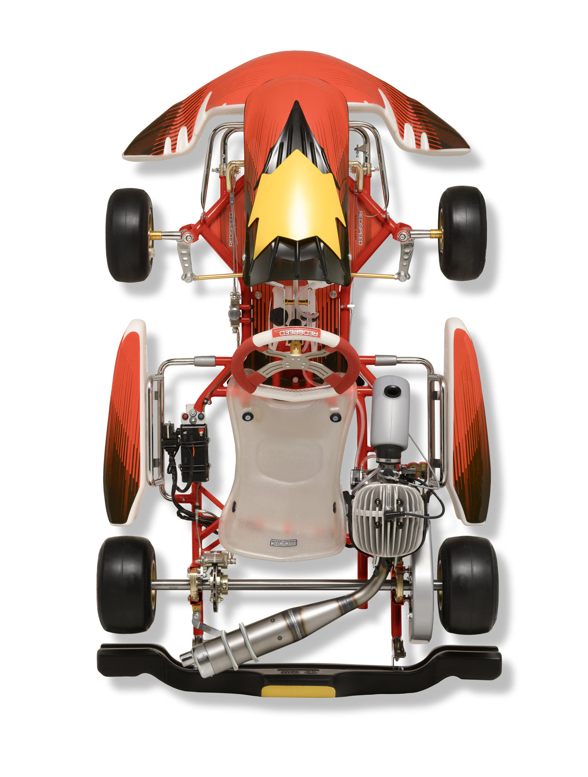 The EVM chassis is equipped with the innovative M9 Nassa Panel and Nose Cone kit, strongly inspired by the M11 model on the Senior kart. The side pods and rear bumper remain unchanged. Attention to detail at the aerodynamic level is evidenced by the introduction of a new integral floor tray, able to reducing vortex and turbulence ultimately leading to better laptimes